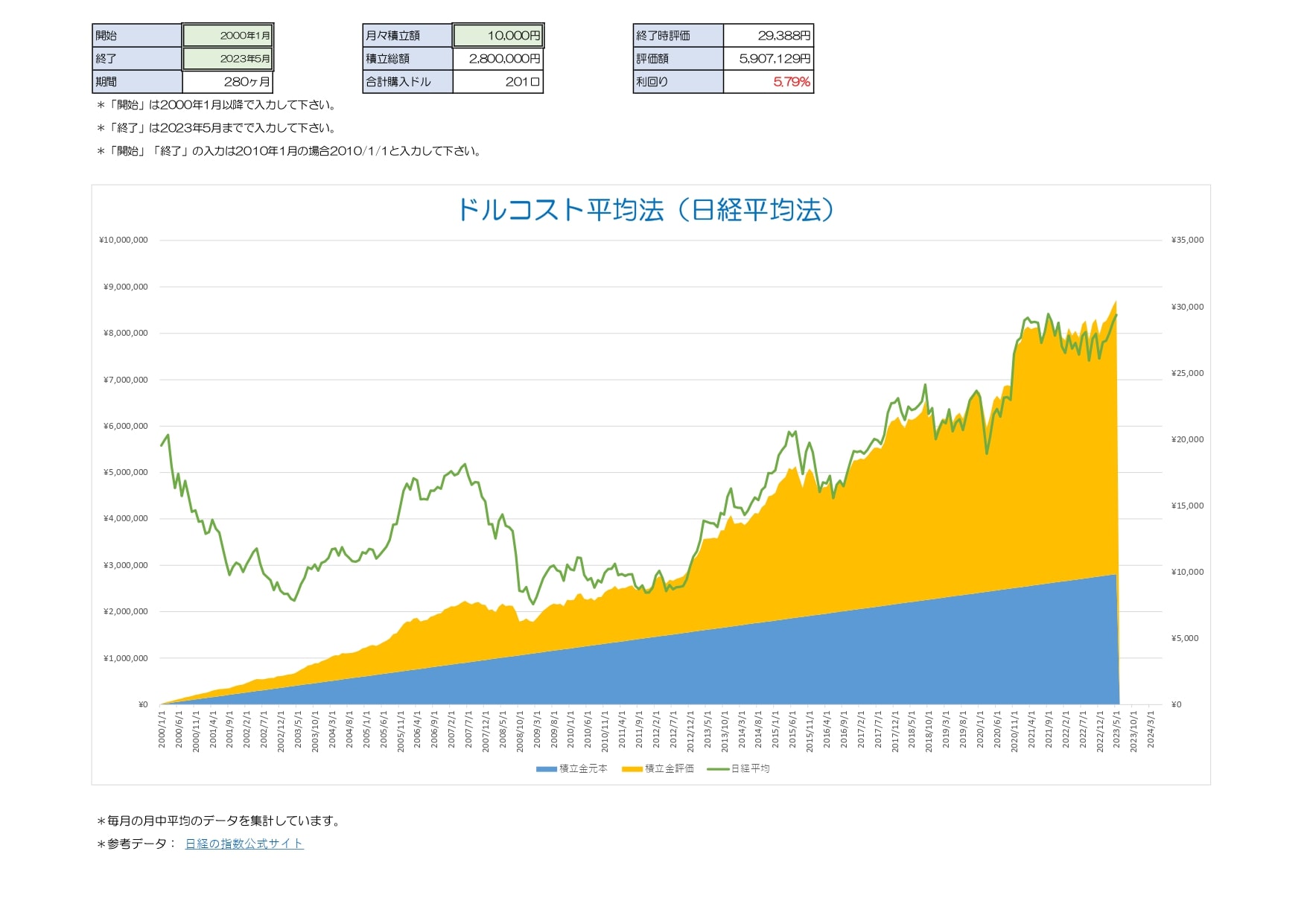 「開始」「終了」「月々積立額」にお好きな数字を入力して下さい。「開始」は2000年1月1日以降で入力可能です。