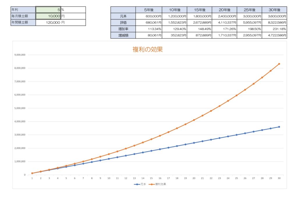 緑の「年利」「毎月積立額」にお好きな数字で入力して下さい。「複利の効果」の表に反映されます。